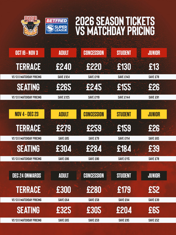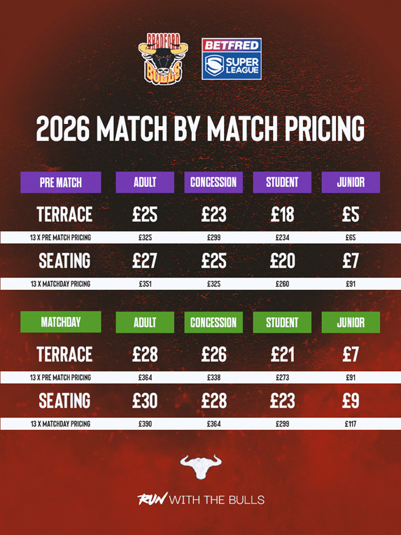 Prices rise slightly into the Early Bird Amber period where you can still watch Super League rugby for less than £21.50 per game — incredible value to see the Bulls back among the best!