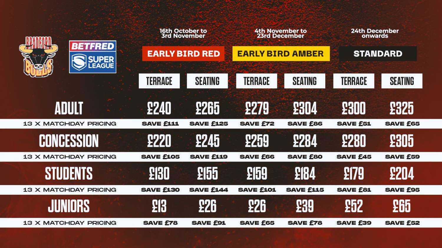Prices rise slightly into the Early Bird Amber period where you can still watch Super League rugby for less than £21.50 per game — incredible value to see the Bulls back among the best!